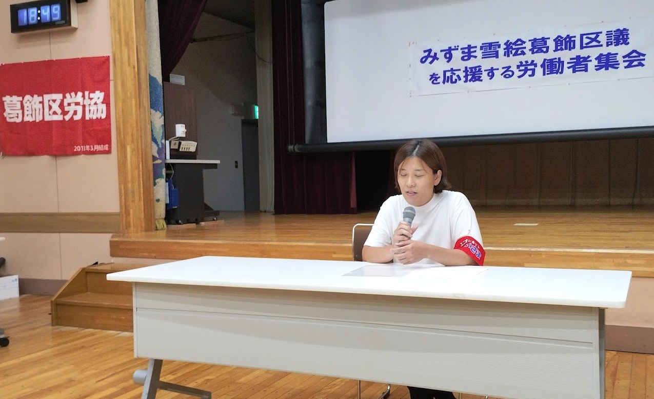 9月16日には「みずま雪絵葛飾区議を応援する労働者集会」が堀切地区センターで開催されました。集会には地域の労働組合・団体などから約80人が集まり、「みずま雪絵」にエールを送りました。
