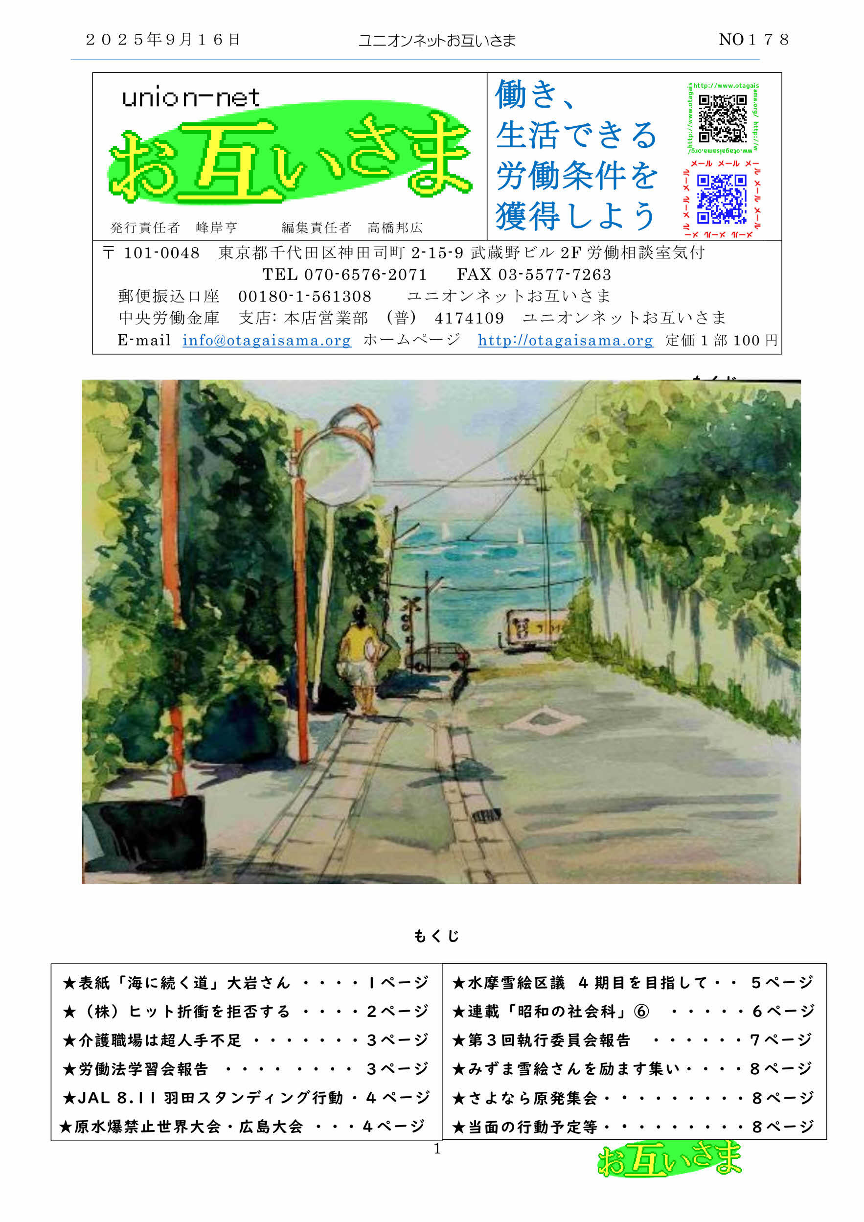 ★表紙「無人の駅」大岩さん ★(合同会社)イチニ団体交渉 ★東大教職員労組の不当労働行為を都労委に蚕は許さない ★新入組合員紹介 Kさん ★コミュニティユニオン大阪総会の案内 ★丸善雄松堂闘争報告 ★きょうされん報告 ★原水爆禁止世界大会に参加して ★JAL機御巣鷹山墜落事故から ★第2回執行委員会報告 ★当面の行動予定等 |