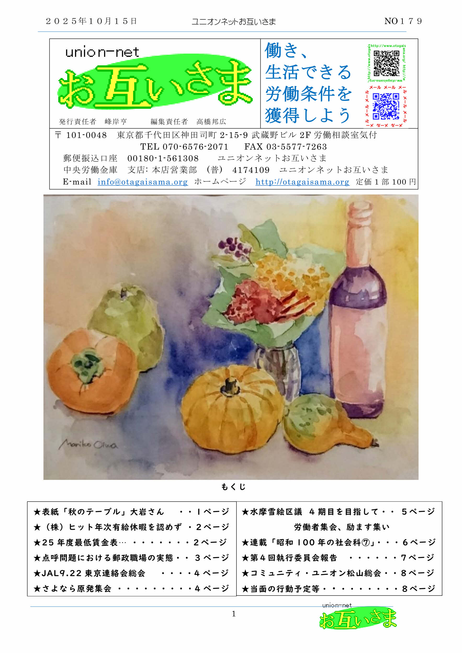 ★表紙「秋のテーブル」大岩さん ★()ヒット年次有給休暇を認めず ★25年度最低賃金表 ★点呼問題における郵政職場の実態 ★JAL9.22東京連絡会総会 ★さようなら原発集会 ★みずま雪絵区議4期目を目指して ★労働者集会 ★励ます集い ★連載「昭和100年の社会科? ★第4回執行委員会報告 ★コミニティ・ユニオン松山総会 ★当面の行動予定など |