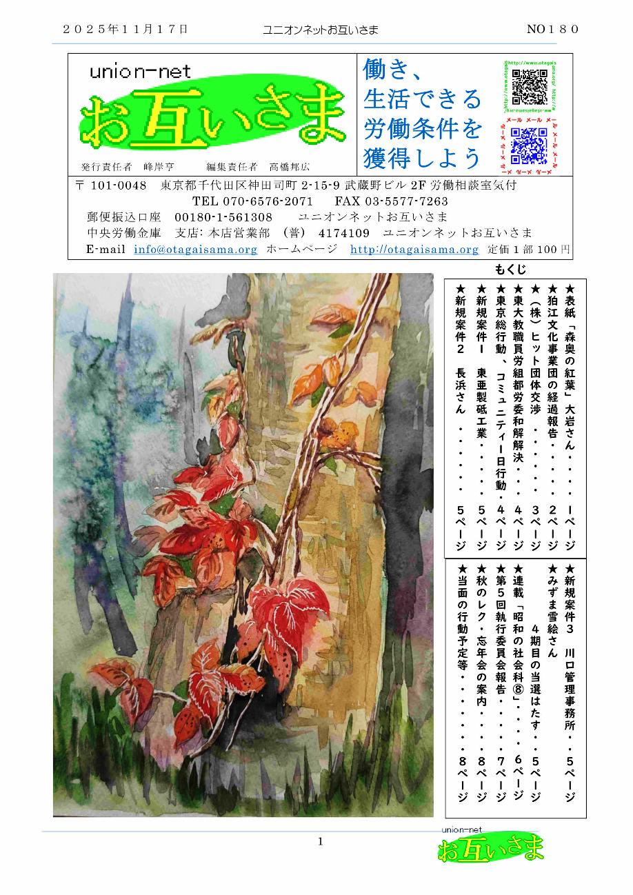 ★表紙「森奥の紅葉」大岩さん ★狛江文化事業団の経過報告 ★(株)ヒット団体交渉 ★東大教職員労組都労委和解解決 ★東京総行動 、コミュニティ1日行動 ★新規案件1 東亜製砥工業 ★新規案件2 長浜さん ★新規案件3 川口管理事務所 ★みずま雪絵さん4期目の当選はたす ★連載「昭和100年の社会科8 ★第5回執行委員会報告 ★秋のレク・忘年会の案内 ★当面の行動予定など |