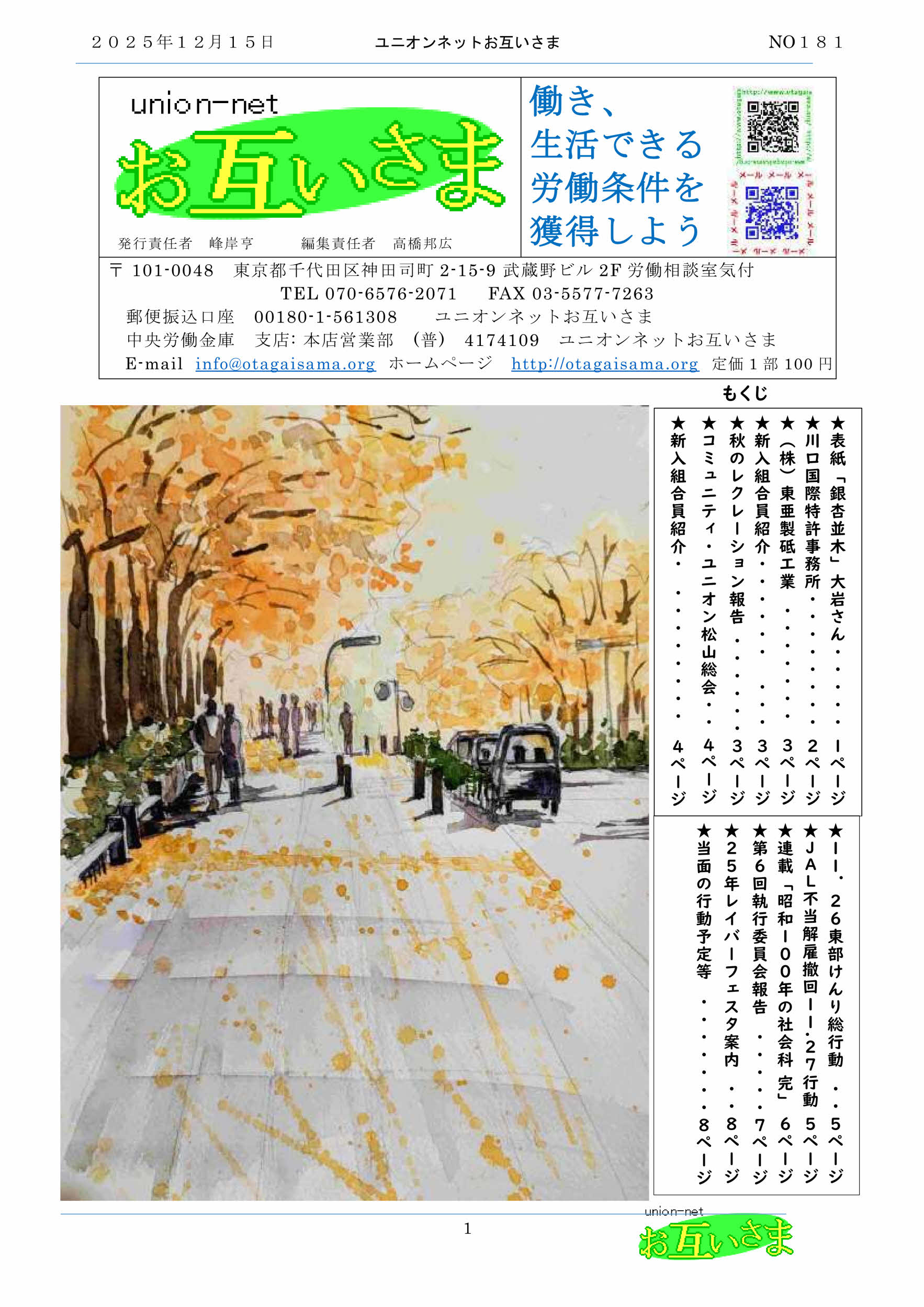 ★表紙「銀杏並木」大岩さん ★川口国際特許事務所 ★(株)東亜製砥工業 ★新入組合員紹介 ★秋のレクレーション報告 ★コミュニティ・ユニオン松山総会 ★新入組合員紹介 ★11.26東部けんり総行動 ★JAL不当解雇撤回11.27行動 完 ★第6回執行委員会報告 ★25年レイバーフェスタ案内 ★当面の行動予定など |