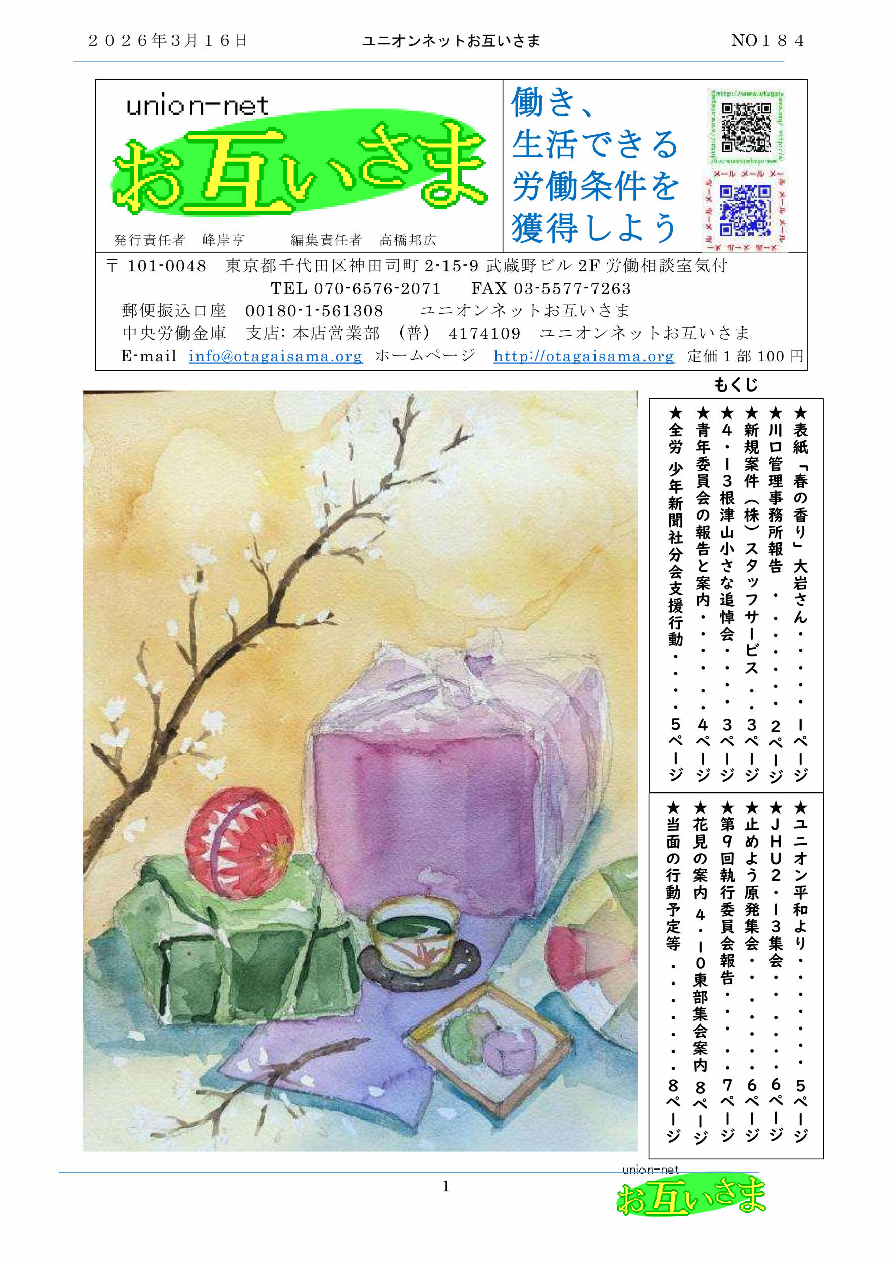 ★表紙「春の香り」大岩さん ★川口管理事務所報告 ★新規案件(株)スタッフサービス ★4・13根津山小さな追悼会 ★青年委員会の報告と案内 ★全労 少年新聞社分会支援行動 ★JHU 2・13集会 ★とめよう原発集会 ★第9回執行委員会報告 ★花見の案内 4・1東部集会案内 ★当面の行動予定など |